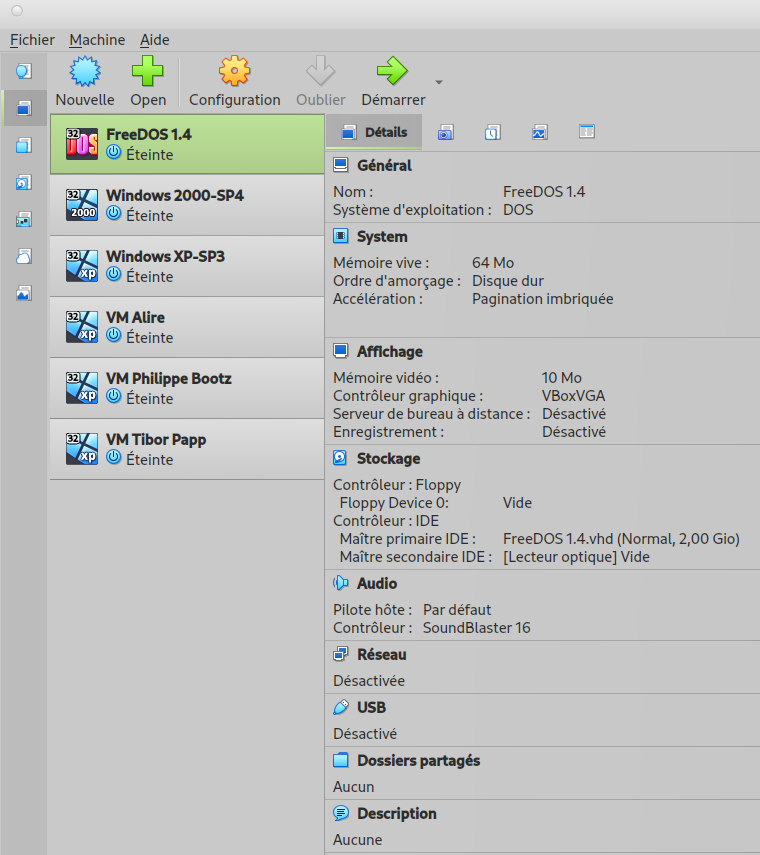 Après avoir installé la version minimale de FreeDOS 1.4 dans VirtualBox, je monte l’image du BonusCD (téléchargée depuis le site officiel sous le nom FD14BNS.iso) dans le lecteur optique virtuel de la machine.
