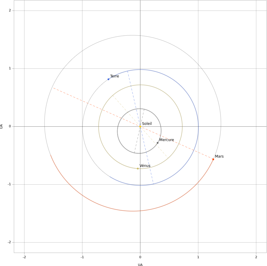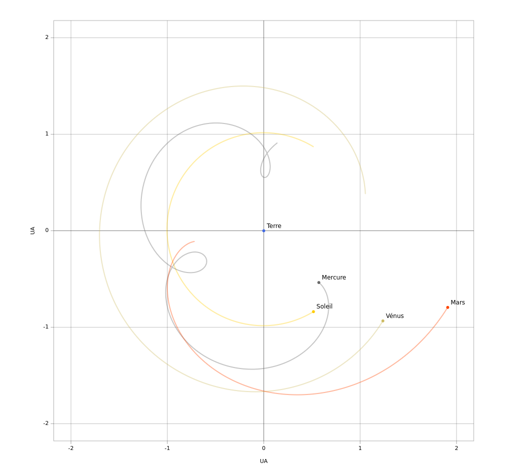 Le programme qui suit simule le système solaire avec des orbites elliptiques (modèle képlérien). Le centre d’observation est paramétrable (Soleil, Terre, Mars, Jupiter…) pour comparer les points de vue : https://entropie.org/simulations/systeme_solaire/